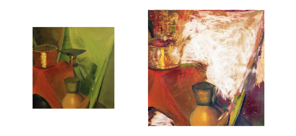 A year or two prior to this particular class, I had been contemplating ways of erasing an oil painting. Due to my tactile fascination of wanting to pursue hidden layers of pigments, I had the idea of applying an electric sander to emulate an erased effect. It was during this critique, the idea came to fruition. I then produced a video of the process entitled, Erasing an Oil Painting.